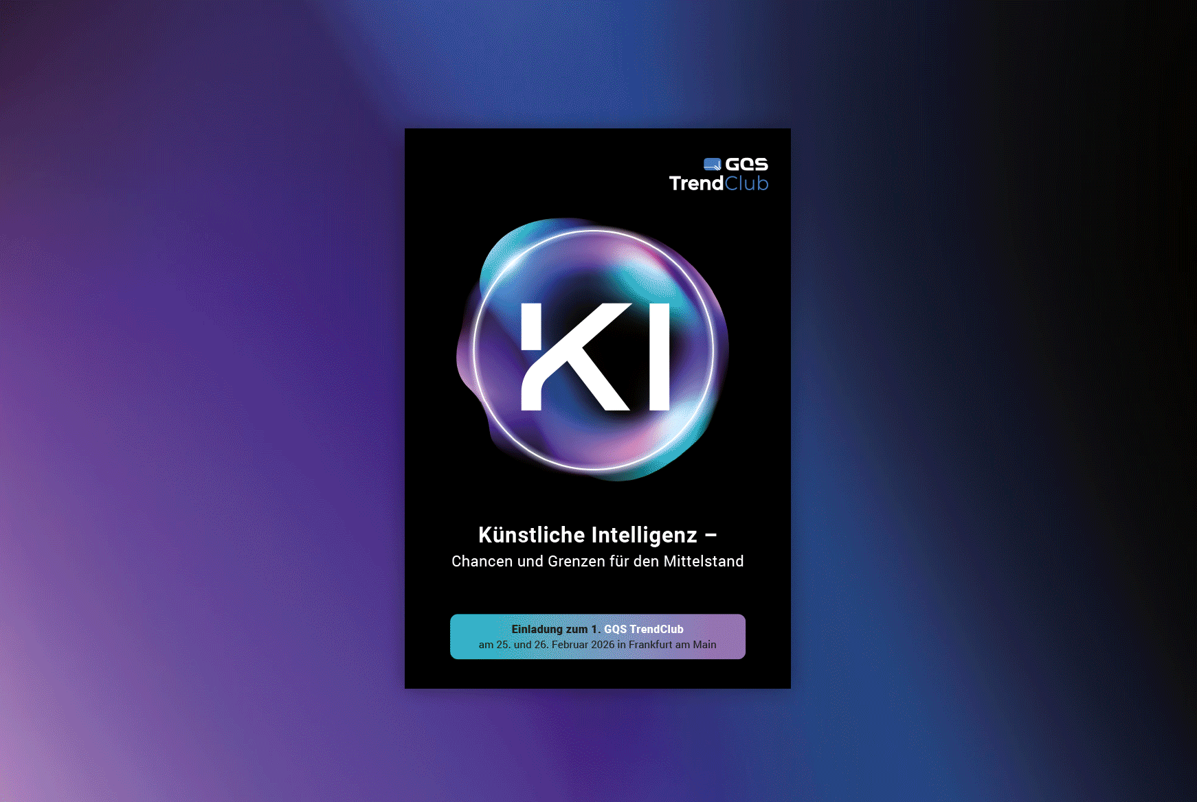Auftaktveranstaltung des 1. GQS TrendClubs in Frankfurt am Main. Im Fokus steht Künstliche Intelligenz und ihre Chancen und Grenzen für den Mittelstand. Experten zeigen praxisnah, wie KI Innovation, Effizienz und Geschäftsmodelle beeinflusst. Ergänzt wird das Event durch Diskussionen und ein Networking-Dinner mit Fußball-Talk.